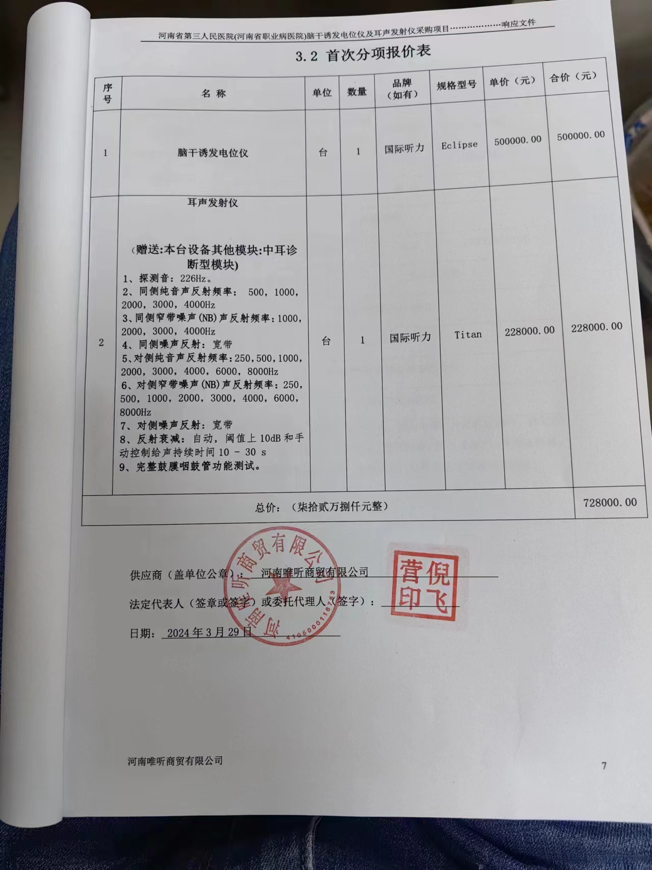 河南省第三人民醫(yī)院(河南省職業(yè)病醫(yī)院)腦干誘發(fā)電位儀及耳聲發(fā)射儀采購(gòu)項(xiàng)目 | 河南唯聽商貿(mào)有限公司 | 安陽(yáng)市北關(guān)區(qū)解放路鴻泰公寓1幢大樓中間辦公樓一樓大門東側(cè) | 723000.00 | 金額 | 元 | ||||
