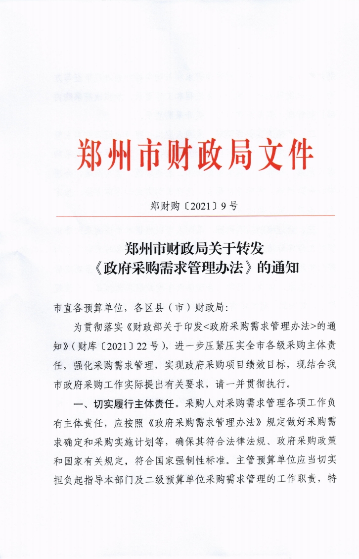 鄭州市財(cái)政局 關(guān)于轉(zhuǎn)發(fā)《政府采購(gòu)需求管理辦法》的通知