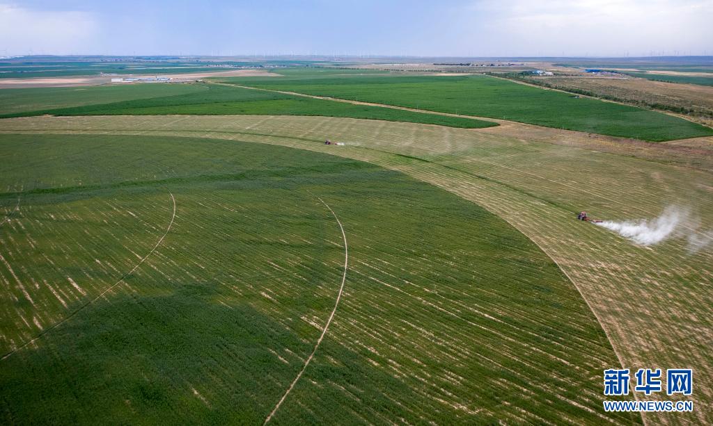 在寧夏鹽池縣馮記溝鄉(xiāng)平臺村的優(yōu)質牧草基地,農戶用機械收割牧草(無人機照片,7月14日攝)。新華社記者 楊植森 攝