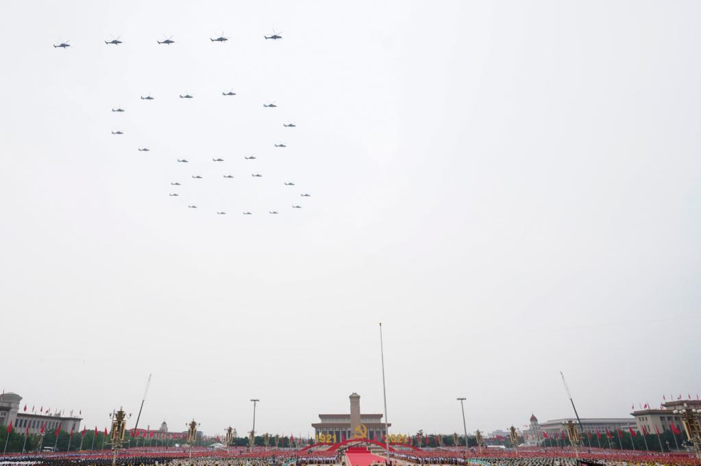 2021年7月1日上午,慶祝中國共產黨成立100周年大會在北京天安門廣場隆重舉行。這是大會開始前的飛行慶祝表演(2021年7月1日攝)。新華社記者 高潔 攝
