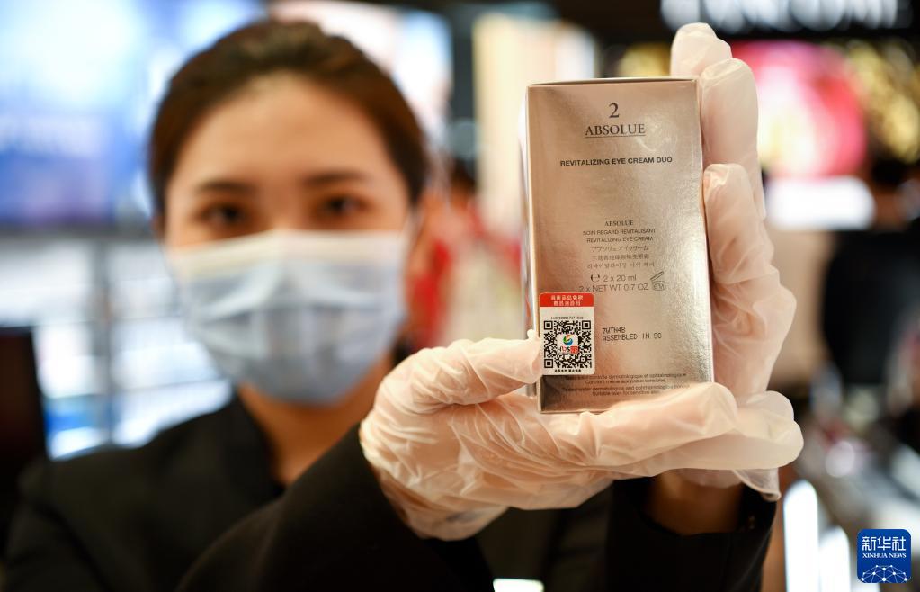 7月31日,海口日月廣場免稅店工作人員展示加貼溯源碼的商品。新華社記者 郭程 攝