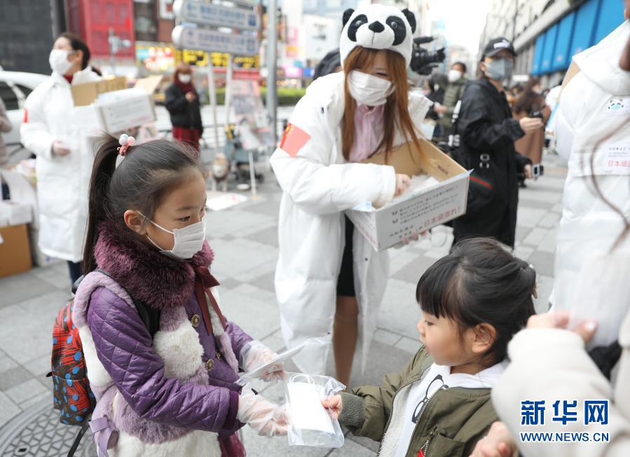 2月29日,在日本東京的池袋站前,在日華僑華人志愿者團體“口罩熊貓行動小組”向當地民眾免費發放口罩,一名小志愿者(左)將兒童用口罩送給日本小朋友。新華社記者 杜瀟逸 攝