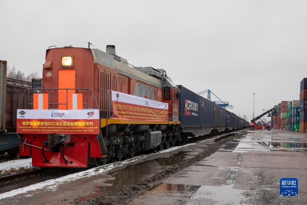2021年3月15日,由中國成都首發(fā)至俄羅斯圣彼得堡市的中歐班列抵達俄羅斯圣彼得堡舒沙雷火車站。新華社發(fā)(俄羅斯鐵路公司十月鐵路局供圖)