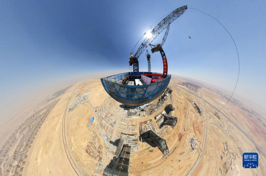 這是2021年6月17日在埃及開羅附近拍攝的埃及新行政首都中央商務區(qū)標志塔(全景相機拍攝)。埃及新行政首都中央商務區(qū)位于首都開羅以東約50公里處,由中國建筑股份有限公司埃及分公司承建。新華社記者 隋先凱 攝