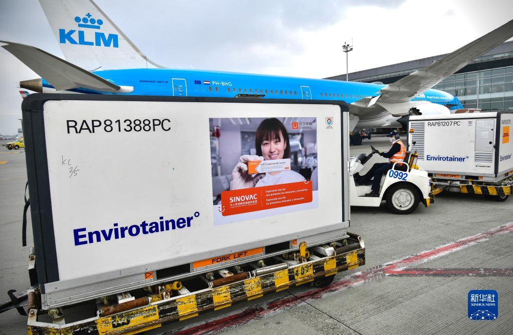 這是2021年3月6日在哥倫比亞波哥大埃爾多拉多國際機場拍攝的剛剛完成卸貨的科興疫苗。新華社發(fā)(哥倫比亞總統(tǒng)府供圖)