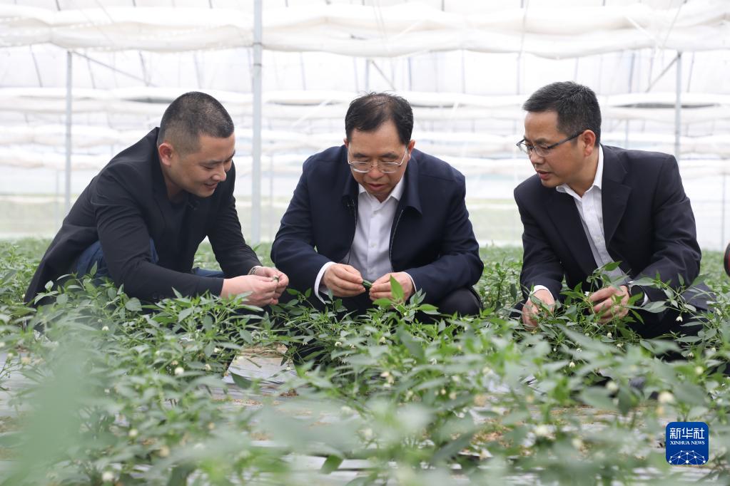 中國工程院院士、湖南農業大學校長鄒學校(中)在樟樹鎮的辣椒基地查看辣椒長勢(資料照片)。新華社發(湖南農業大學供圖)
