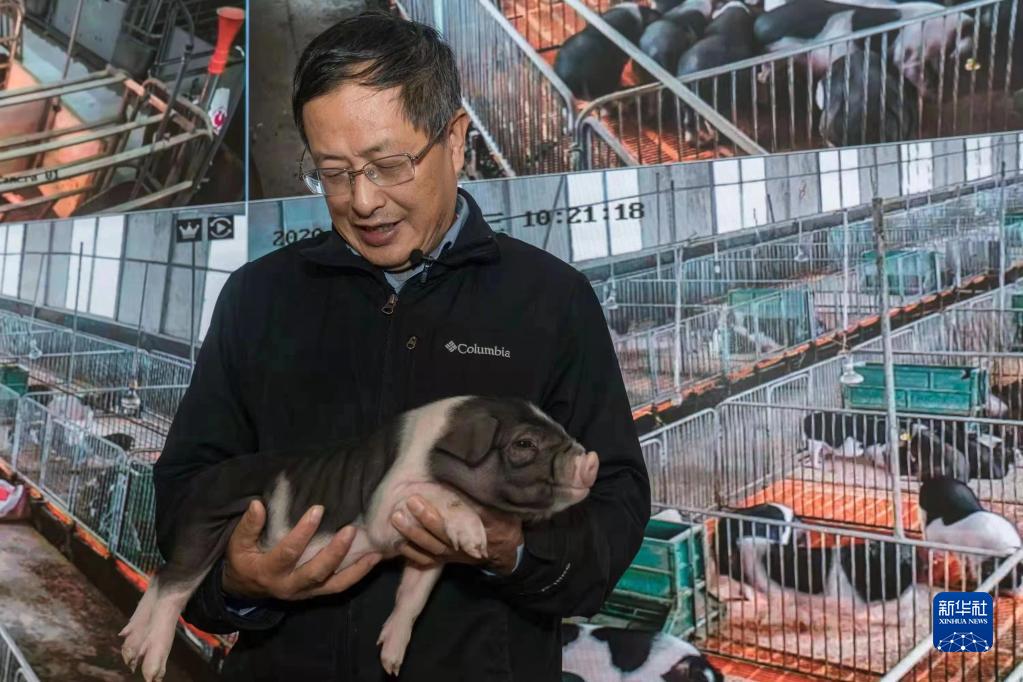 在寧鄉國家現代農業產業園,中國工程院院士、中國科學院亞熱帶農業生態研究所首席研究員印遇龍在查看寧鄉花豬(資料照片)。新華社發(受訪者供圖)