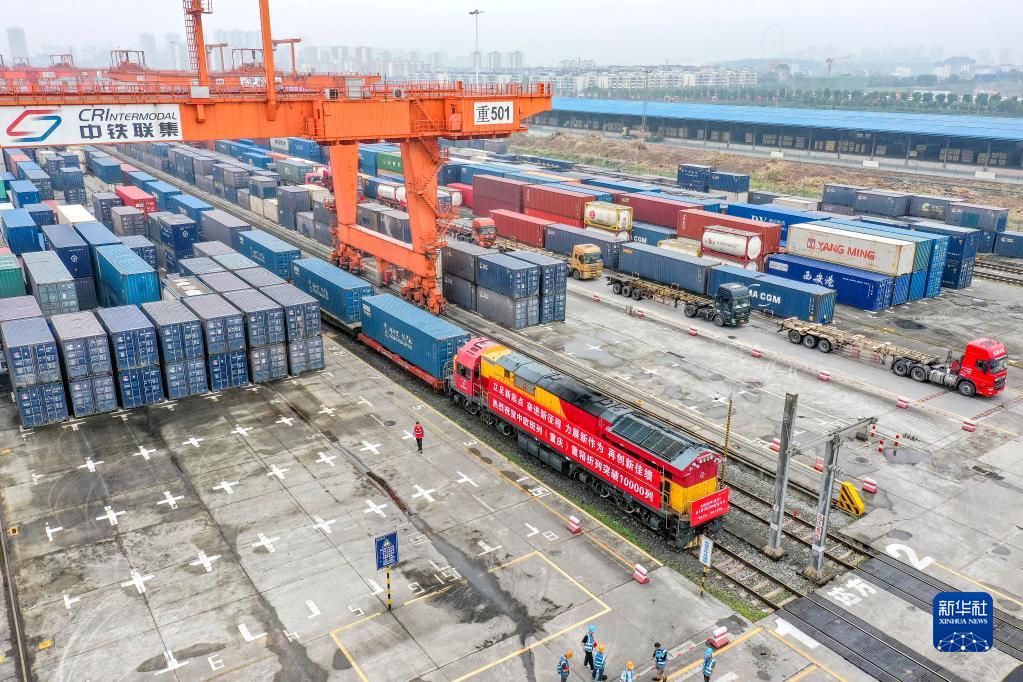 中歐班列(重慶)第10000列列車在重慶團結村中心站等待發車(2022年6月23日攝,無人機照片)。新華社記者 黃偉 攝