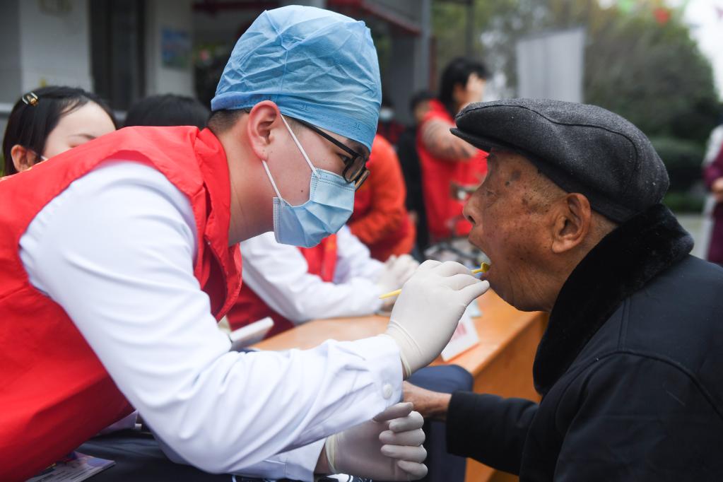 2022年3月4日,在浙江余姚市臨山鎮敬老院,志愿者在給老人檢查口腔。新華社記者 徐昱 攝