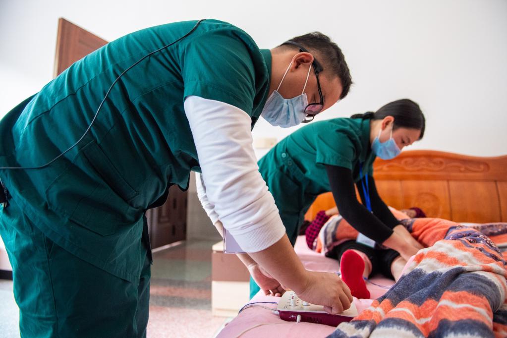 2021年11月12日,在湖南省長沙市長沙縣果園鎮楊泗廟社區,醫務人員彭永(左)、劉敏給居家老人做理療。新華社記者 陳思汗 攝