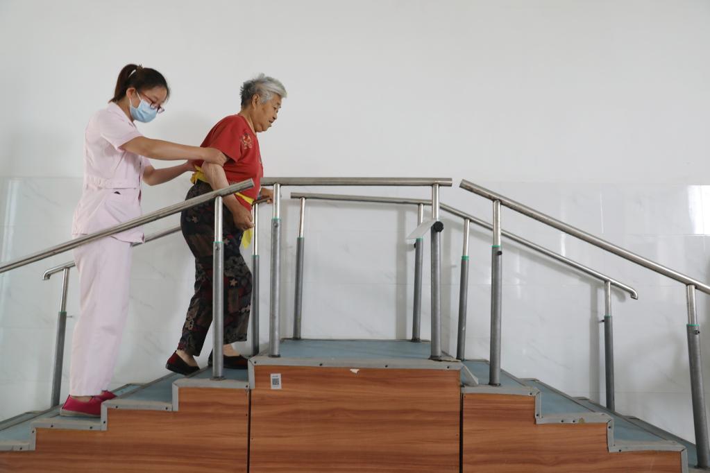 2021年7月3日,在河南省焦作市溫縣養老護理院醫養中心,一名醫護人員幫助一名老人進行康復訓練。新華社發(徐宏星 攝)