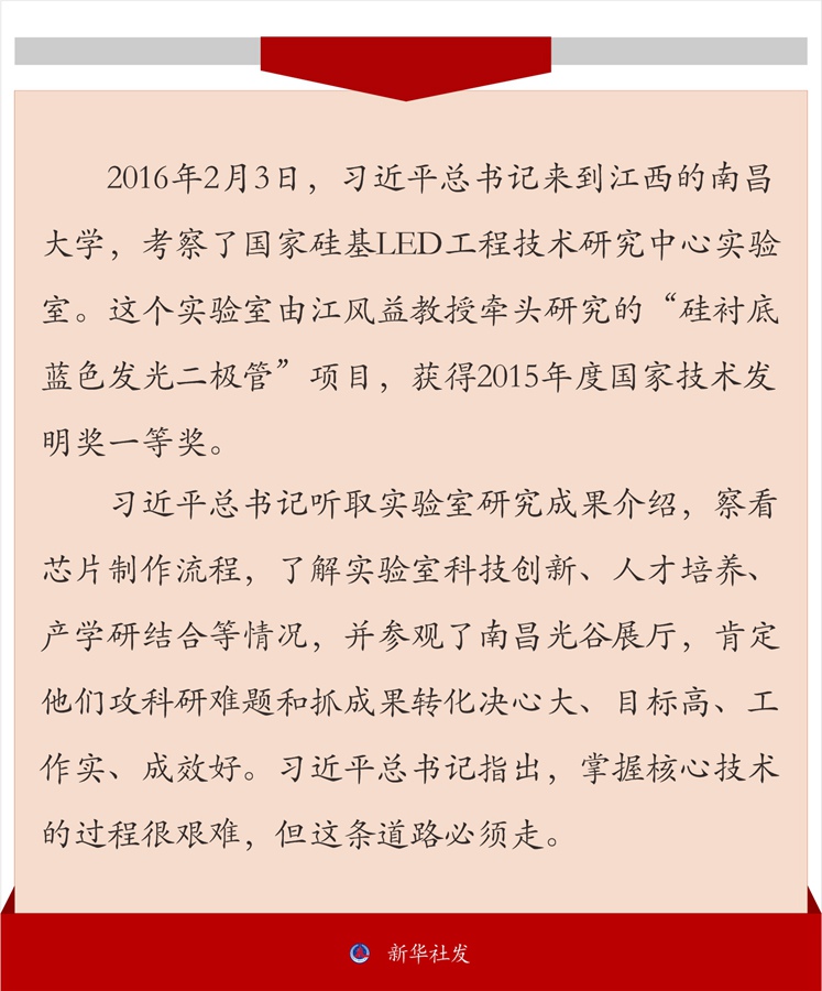 2016年2月3日,習近平總書記來到江西的南昌大學,考察了國家硅基LED工程技術研究中心實驗室。這個實驗室由江風益教授牽頭研究的“硅襯底藍色發光二極管”項目,獲得2015年度國家技術發明獎一等獎。