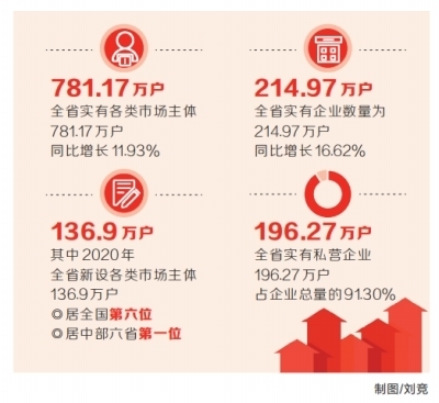 數(shù)據(jù)顯示,截至去年年底,全省實有各類市場主體781.17萬戶,同比增長11.93%。其中2020年全省新設(shè)各類市場主體136.9萬戶,居全國第6位、中部六省第1位。