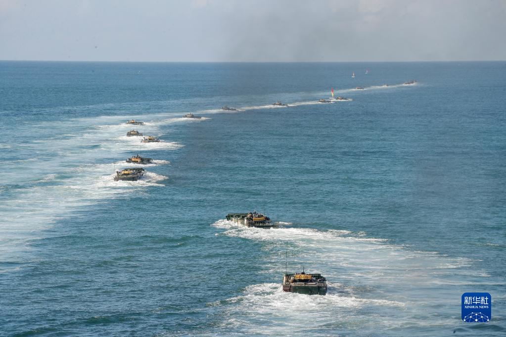 陸軍第74集團軍某合成旅兩棲裝甲車進行海上泛水編波訓練(2020年8月14日攝)。新華社發(fā)(李彬 攝)
