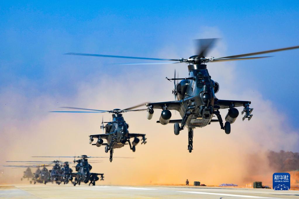 陸軍第73集團軍某陸航旅組織飛行訓練,戰(zhàn)機編隊依次起飛(2021年4月22日攝)。新華社發(fā)(李士龍 攝)