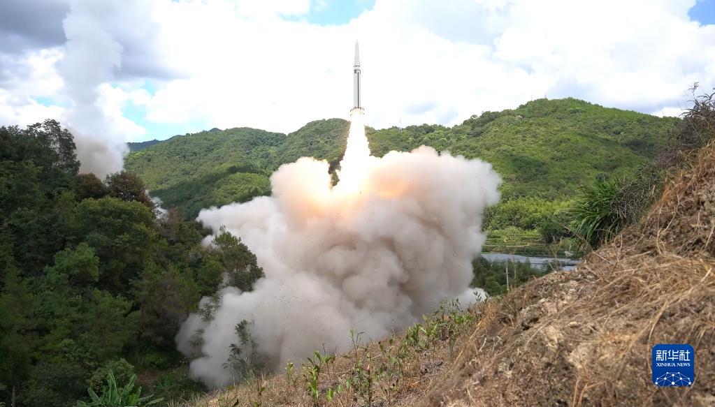 東部戰(zhàn)區(qū)火箭軍對臺島東部外海預定海域?qū)嵤┗鹆ν粨簟_@是導彈發(fā)射升空(2022年8月4日,視頻截圖)。新華社發(fā)