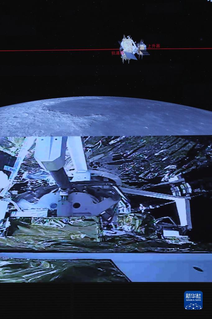 這是在北京航天飛行控制中心指揮大廳拍攝的嫦娥五號上升器與軌道器返回器組合體交會對接畫面(2020年12月6日攝)。新華社記者 金立旺 攝