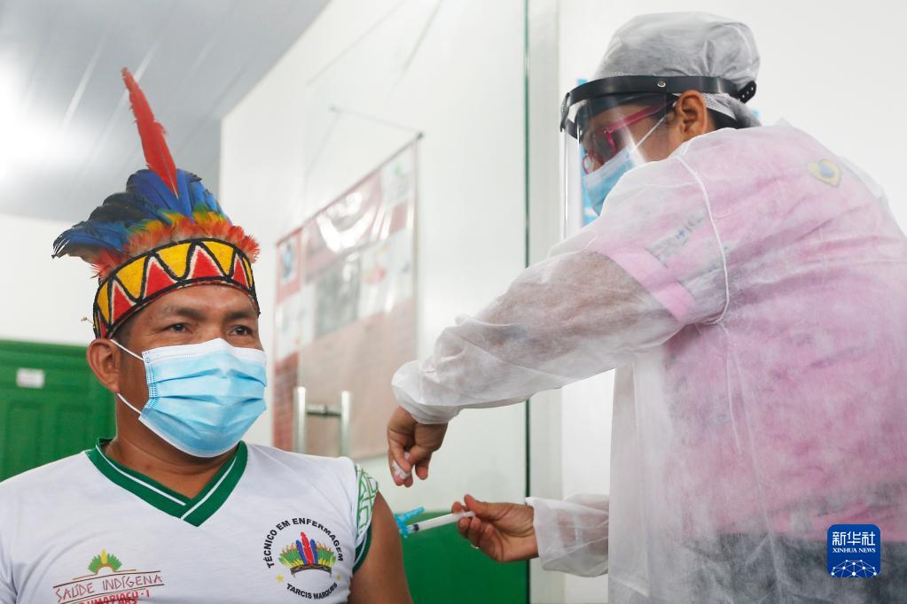 醫護人員在巴西亞馬孫州塔巴廷加市為一名原住民接種中國新冠疫苗(2021年1月19日攝)。新華社發(盧西奧·塔沃拉攝)