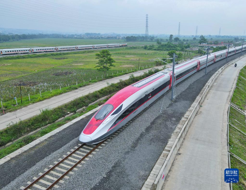 在印度尼西亞西爪哇省萬隆市,一列高鐵動車組正在雅萬高鐵試驗段進行熱滑試驗(2022年11月9日攝,無人機照片)。新華社發(李培養攝)