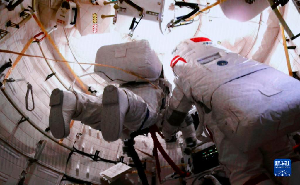 2月9日在北京航天飛行控制中心拍攝的神舟十五號航天員費俊龍(右)、張陸(左)開展艙外操作的畫面。新華社記者 劉芳 攝