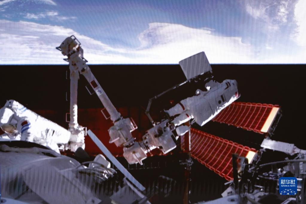 2月9日在北京航天飛行控制中心拍攝的神舟十五號航天員費俊龍開展艙外操作的畫面。新華社記者 劉芳 攝