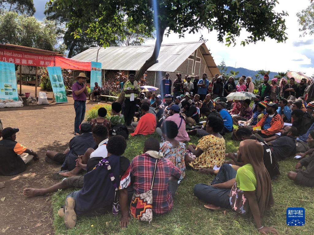 中國援巴布亞新幾內亞菌草旱稻項目專家組組長林應興(戴草帽者)在巴布亞新幾內亞東高地省中國援助巴新菌草和旱稻技術項目第9期培訓班上授課(2020年12月15日攝)。新華社發