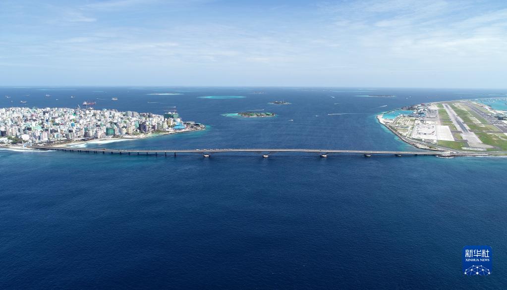 這是在馬爾代夫航拍的連接首都馬累和機場島的中馬友誼大橋(2019年8月30日攝)。新華社發(王明亮攝)