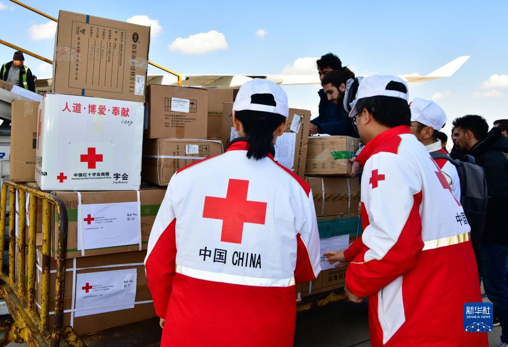 工作人員在敘利亞大馬士革國際機場卸載中國紅十字會援助的人道主義物資(2023年2月13日攝)。新華社發(阿馬爾·薩法爾賈拉尼攝)