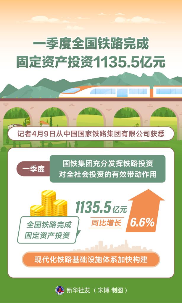 ?? 新華社北京4月9日電(記者樊曦)記者9日從中國國家鐵路集團有限公司獲悉,一季度,國鐵集團充分發(fā)揮鐵路投資對全社會投資的有效帶動作用,全國鐵路完成固定資產(chǎn)投資1135.5億元、同比增長6.6%,現(xiàn)代化鐵路基礎設施體系加快構建。