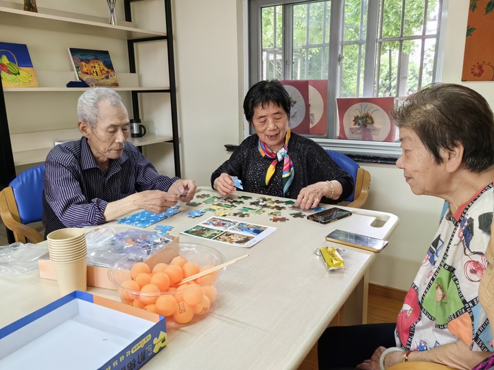 5月27日,上海市普陀區真如鎮街道一家老年人日間照料中心內,老人們正在玩拼圖游戲。新華社記者吳振東 攝