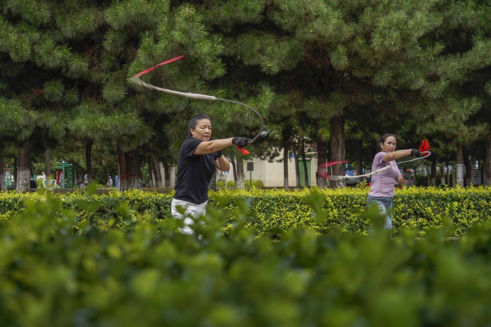2023年8月6日,市民在河北省遵化市人民公園練習(xí)健身鞭。新華社發(fā)(劉滿倉(cāng)攝)