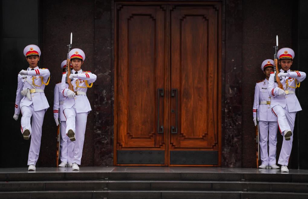 在河內地標巴亭廣場一側,坐落著胡志明陵和胡志明故居。記者抵達廣場時,守衛胡志明陵的儀仗兵正在舉行換崗儀式,眾多民眾和游客高舉相機或手機,記錄下這莊嚴肅穆的一刻。胡志明陵北側的胡志明故居內,各國游客排起長隊,在他曾長期居住和工作的高腳屋下駐足留影。