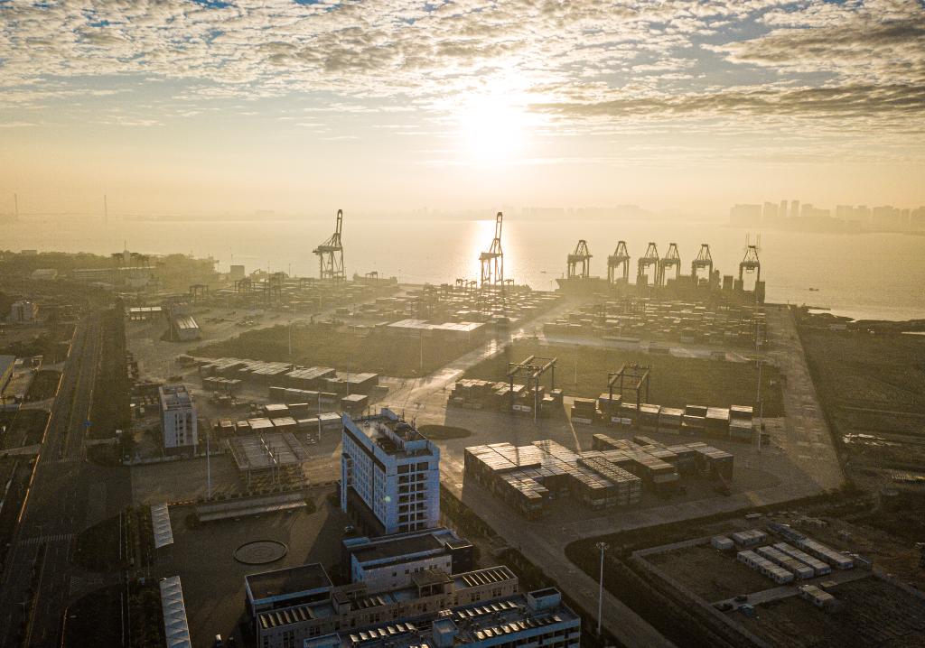 ??2024年1月1日在海南省洋浦經濟開發區拍攝的海南自貿港集裝箱航運樞紐——洋浦國際集裝箱碼頭(無人機照片)。新華社記者 蒲曉旭 攝