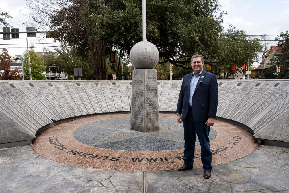 ??2023年12月8日,美國(guó)休斯敦市區(qū)的二戰(zhàn)紀(jì)念廣場(chǎng),杜立特突襲者子女協(xié)會(huì)負(fù)責(zé)人戴維·坎滕伯格在紀(jì)念碑前接受新華社記者采訪。