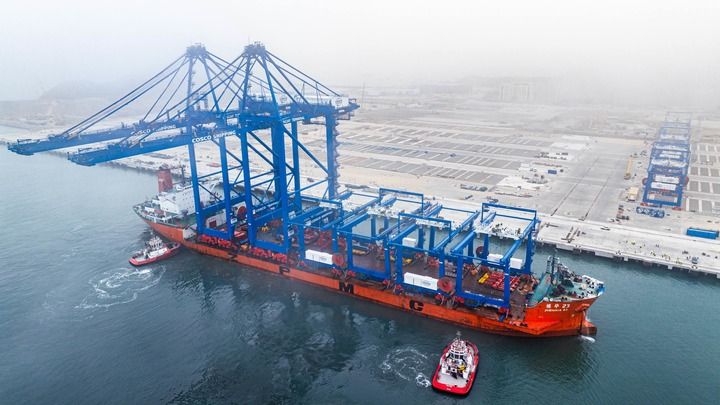 ??6月27日,岸邊集裝箱起重機和軌道吊運抵秘魯錢凱港。新華社發(上海振華重工供圖)
